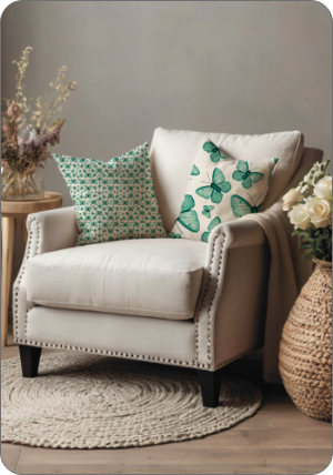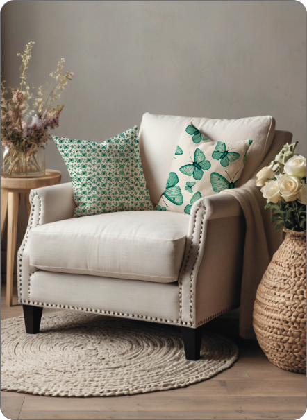 Die Hauptfarben sind sanfte Petrol-, Grün- und Blautöne, ergänzt durch dezente dunkle Details. Diese Farbwahl vermittelt eine ruhige, natürliche und fast mystische Ausstrahlung.
